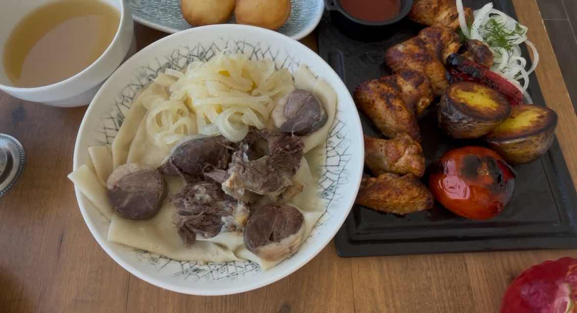 Beshbarmak is the national dish of Kazakhstan. The word translates as "five fingers", referring to the traditional practice of eating the dish with one's hands, a common eating method of Central Asia's nomadic peoples. Beshbarmak is usually made from finely chopped boiled meat - most typically, horse, mixed with dough and chyk, an onion sauce. It is typically served on large communal platters and shared among several people. A bowl of the meat broth is also served to help with settling the stomach. The restaurant where we ate is famous for making a fish version of the dish. We decided, however, to ask for ours to be made with beef, instead of fish or horse.
