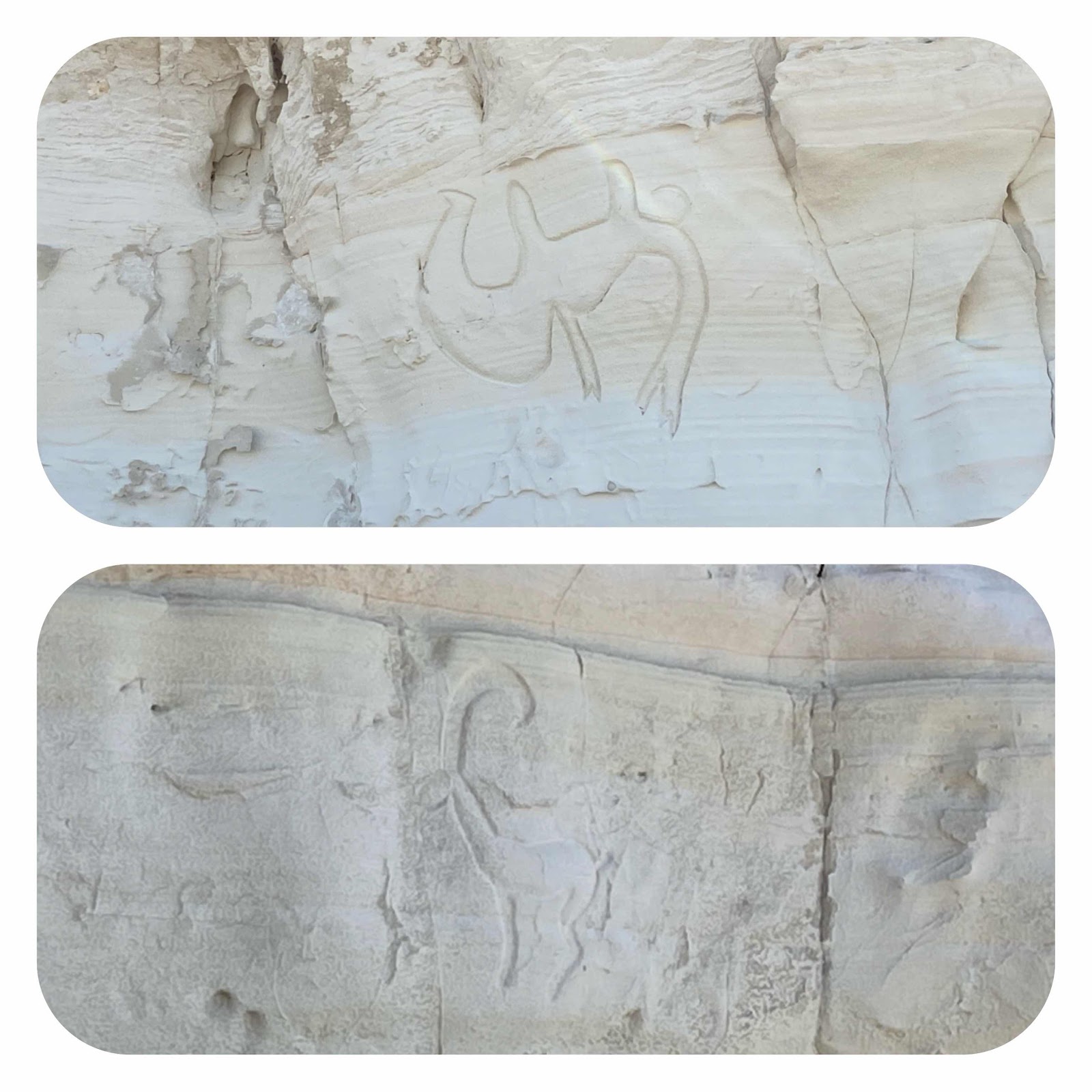 Petroglyphs chiseled into the limestone cliffs on Aktau's seacoast.