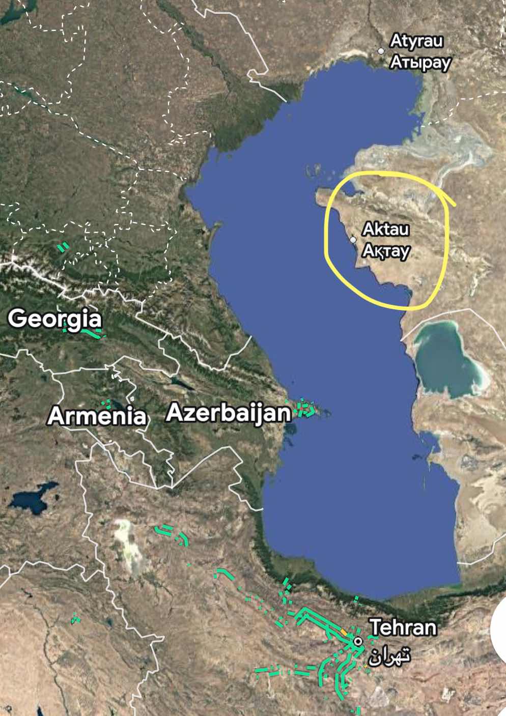 Aktau's location on the Caspian Sea, the world's largest lake. Tehran, Iran is to the south; Baku, Azerbijan (of Formula 1 racing fame) is to the west.