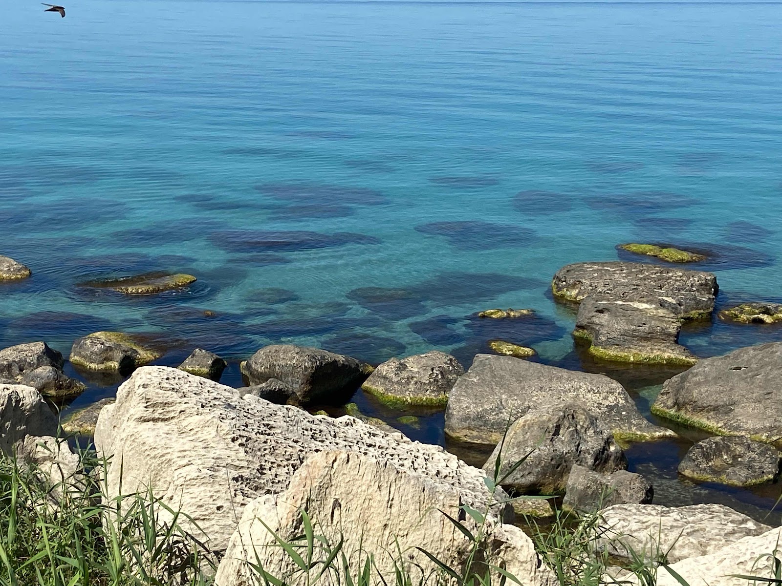 The turquoise waters of the Caspian Sea and Aktau's boulder-ridden coastline.