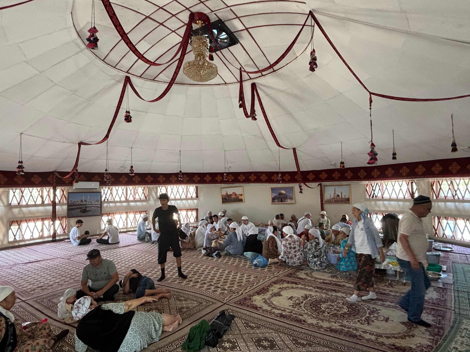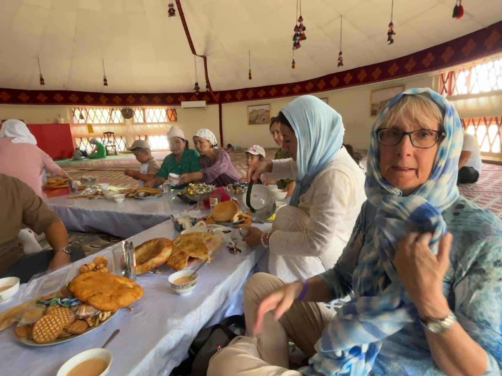 Inside the yurt at the communal meal. Later in the day, at the next holy site, beshbermak was served. Picture about 10 women sitting around a huge metal bowl of beshbermak, all eating from the same bowl with their right hands. ("Beshbermak" translate "five fingers".) It was quite an experience to be invited into these meals. Everyone brings some sort of food to contribute to the community, and there is hot tea in great quantities.