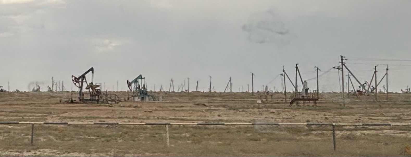 The oil fields of Mangystau Desert are quite something. Pumpers cover the landscape, and new wells are being drilled everywhere you look.