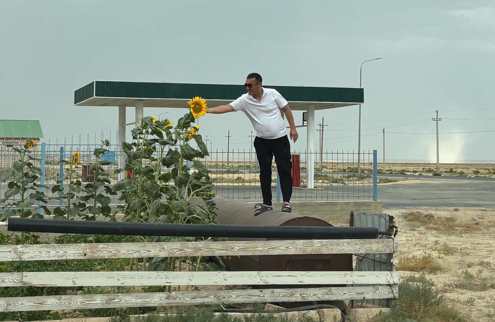 Our driver, checking out sunflowers, as his vehicle is filled with gas. Sunflowers are rare in these parts. Our driver, who has four kids and another on the way, works in the oil patch. He drives tourists and holy site pilgrims on his days off to supplement his income.
