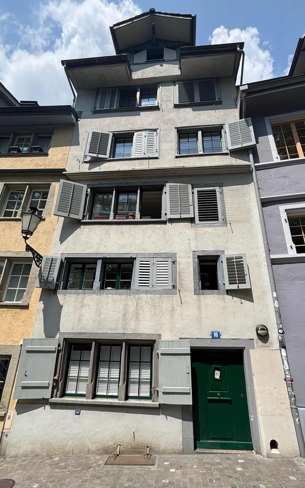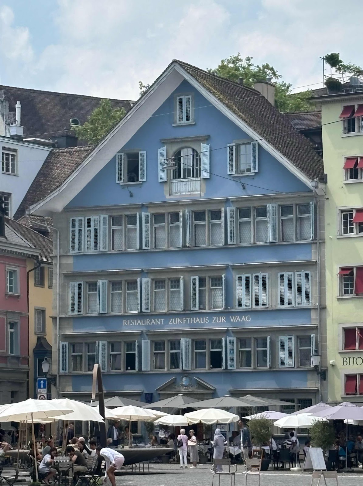 This house, just another typical Zurich house was built in 1534! Notice the window on the very top floor with the joyce sticking out: it was used to hoist things up to various levels in the house. This was typical of Medieval homes.
