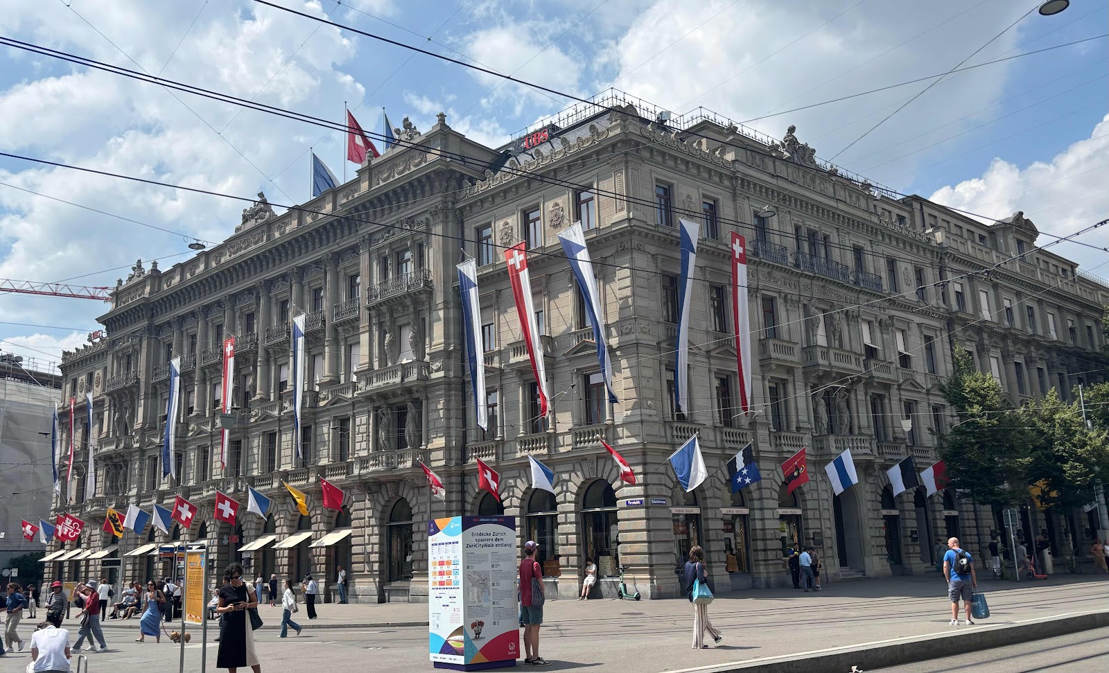 Well fed from lunch, we set out to do a five kilometre tour, starting at the Bahnhof (‘train station’), going up one side of the Limmat River to Zurich Lake, and then down the other side of the river, back to the Bahnhof. This is BahnhofStrasse - Zurich’s most important street, lined with everything from prestigious banks to the world’s top retail brands.