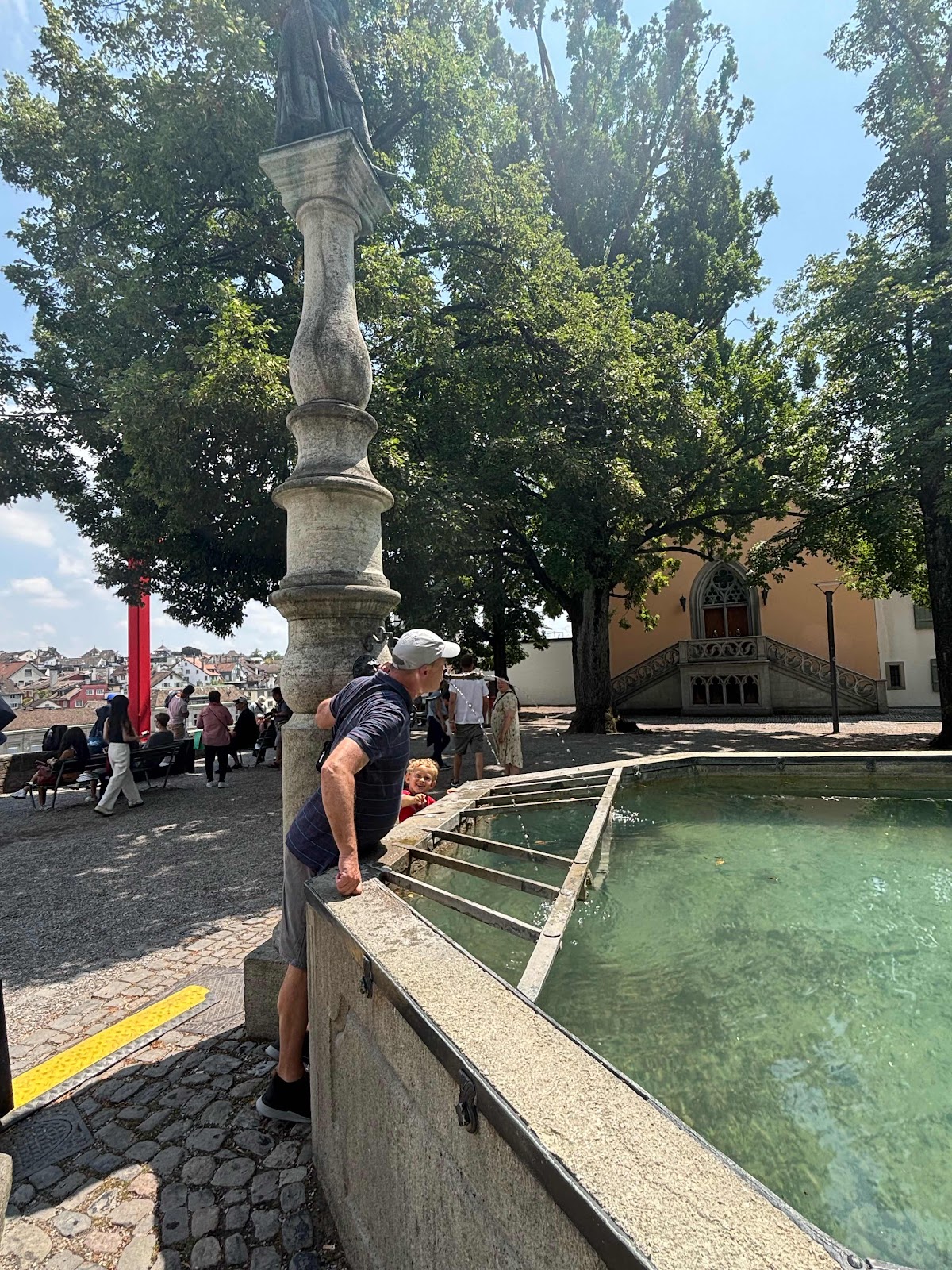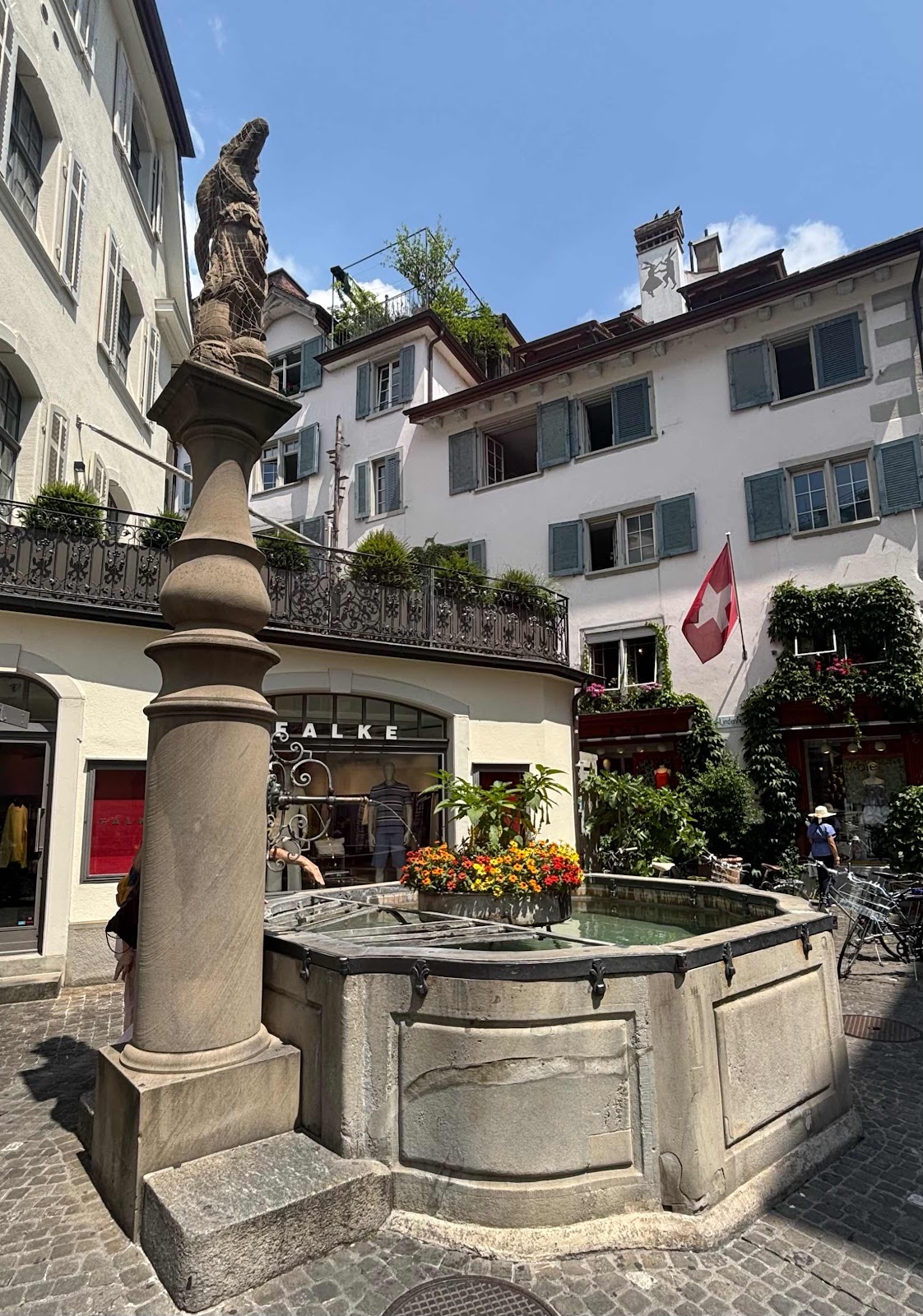 Every place has it unique features, and one of Zurich’s is the availability of pure, fresh water all over the city, at fountains like this. It is quite normal to take a drink from the fountain, so I got right into it! In the 27C heat, the cool water available from the fountains was wonderfully refreshing.