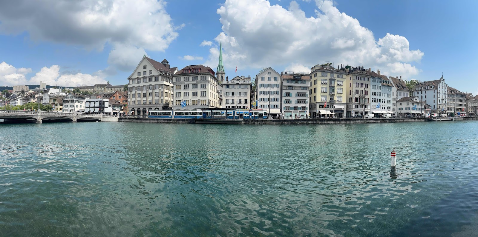 One of Zurich’s most photographed scenes: looking up river towards the city’s most iconic buildings, lining both sides of the Limmat River.
